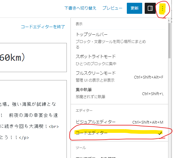 編集画面の右上部分を2回クリックし、コードエディターを選択。