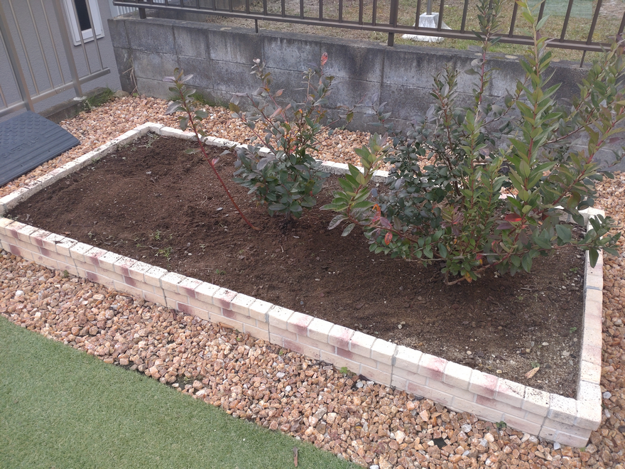 ・ウッドチップと表面の土を軽く回収した上で、ピートモスと鹿沼土の混合土を盛土